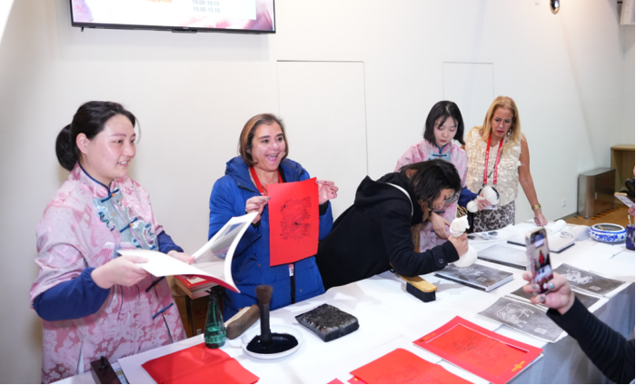 在“华夏之光”展厅,嘉宾们沿着中华科技文明的发展历程,领略中外科技文明交融互鉴所迸发的科技智慧,在“大花楼织机”前欣赏科技辅导员在织机上互相配合,亲眼见证繁复花纹的织就;在“水运仪象台”长久驻足,赞叹古代科学家和劳动人民伟大的智慧;在“木版水印”“造纸术”表演中争相参与,认真勾描出独具中国特色的年画作品。通过亲身实践一系列古老技艺,他们化身为历史的亲历者,感悟中华科技文明的独特魅力与深厚底蕴。